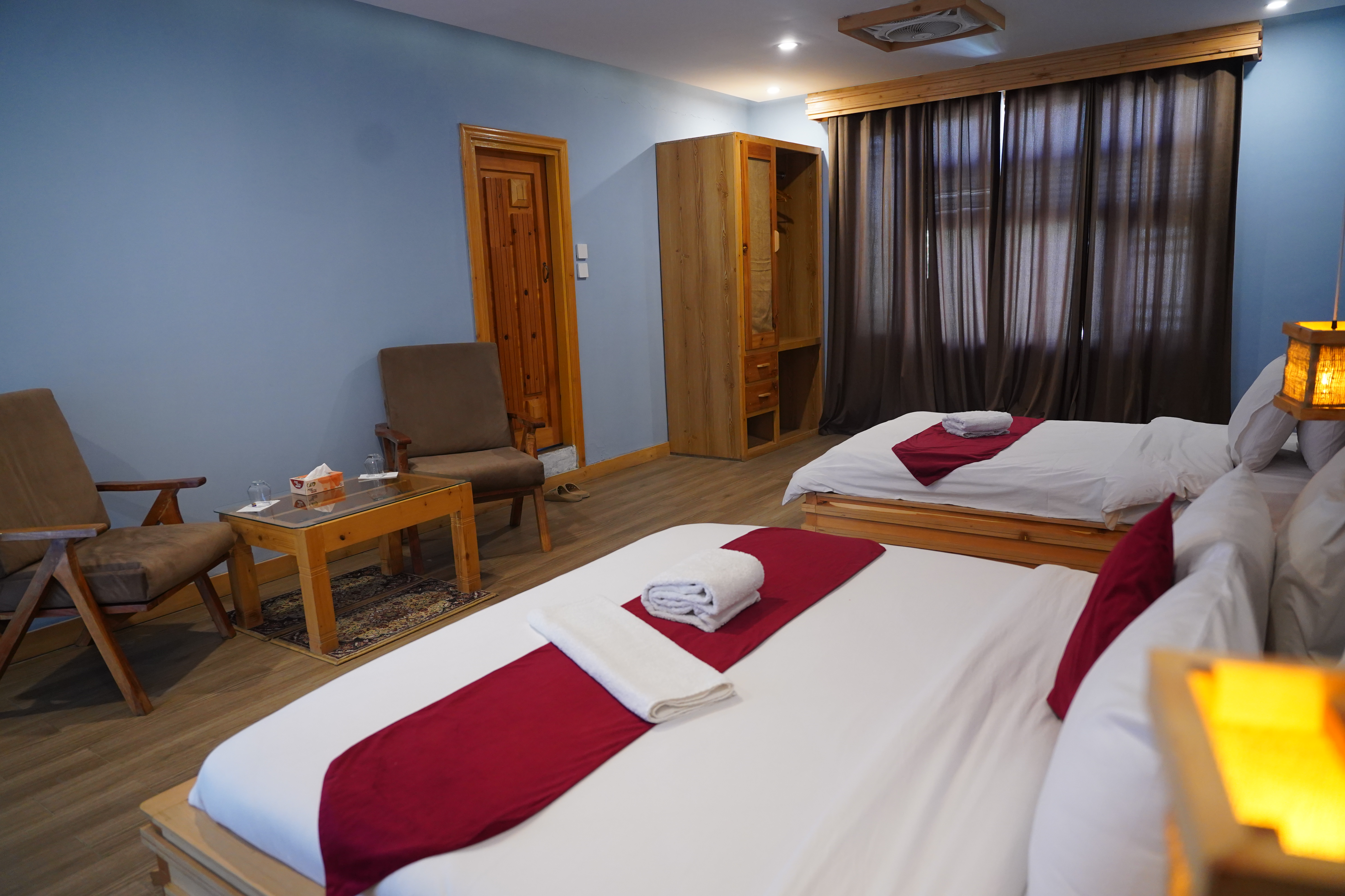Rooms are equipped with cozy beds, desk and seating space, terrace access in select rooms, and garden views to enhance your restful evenings after exploring the valleys and lakes around Skardu.